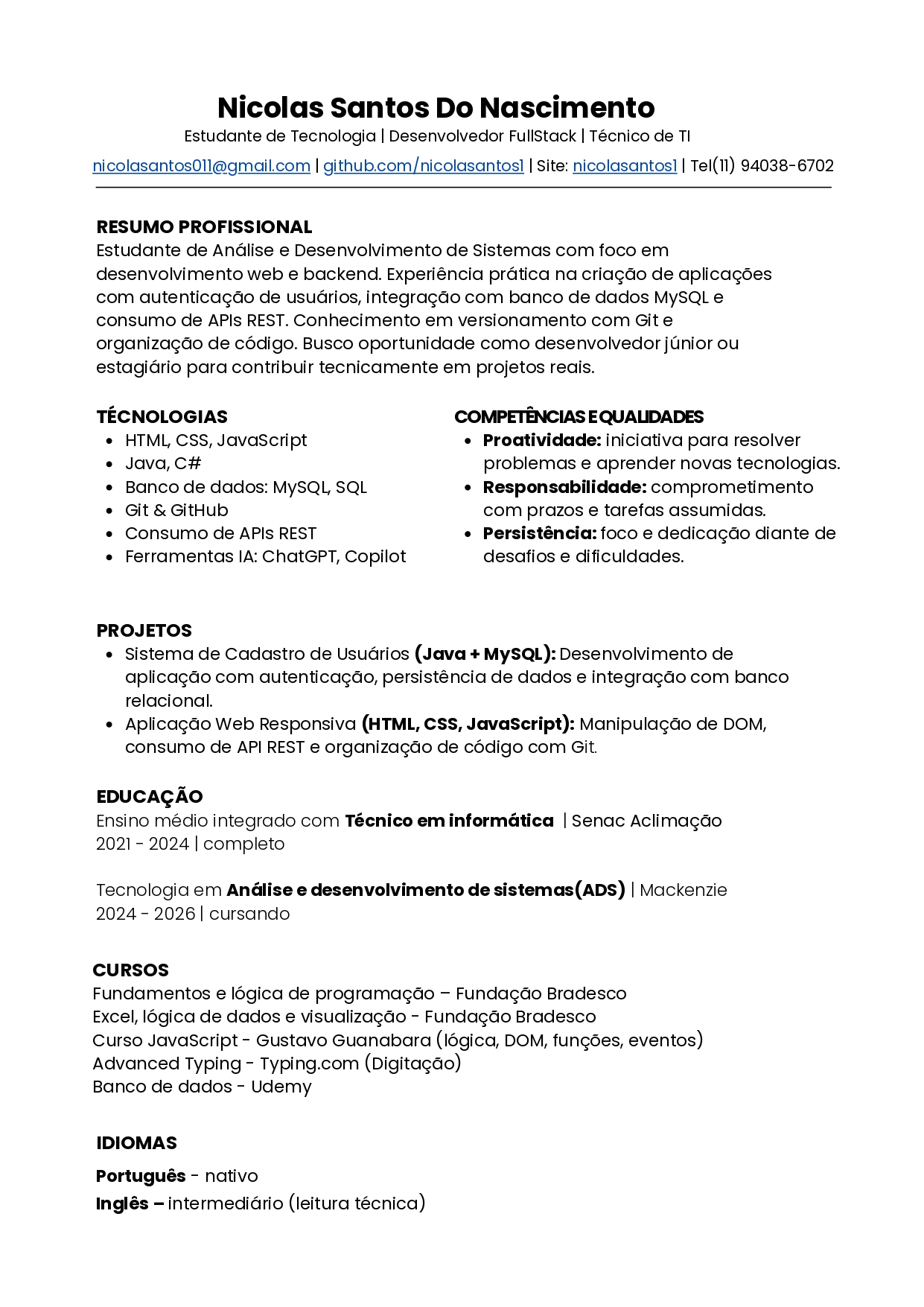 Atualmente, estou expandindo meus conhecimentos para o back-end, estudando conceitos como APIs, bancos de dados e integração entre sistemas, com o objetivo de me tornar um desenvolvedor mais completo.